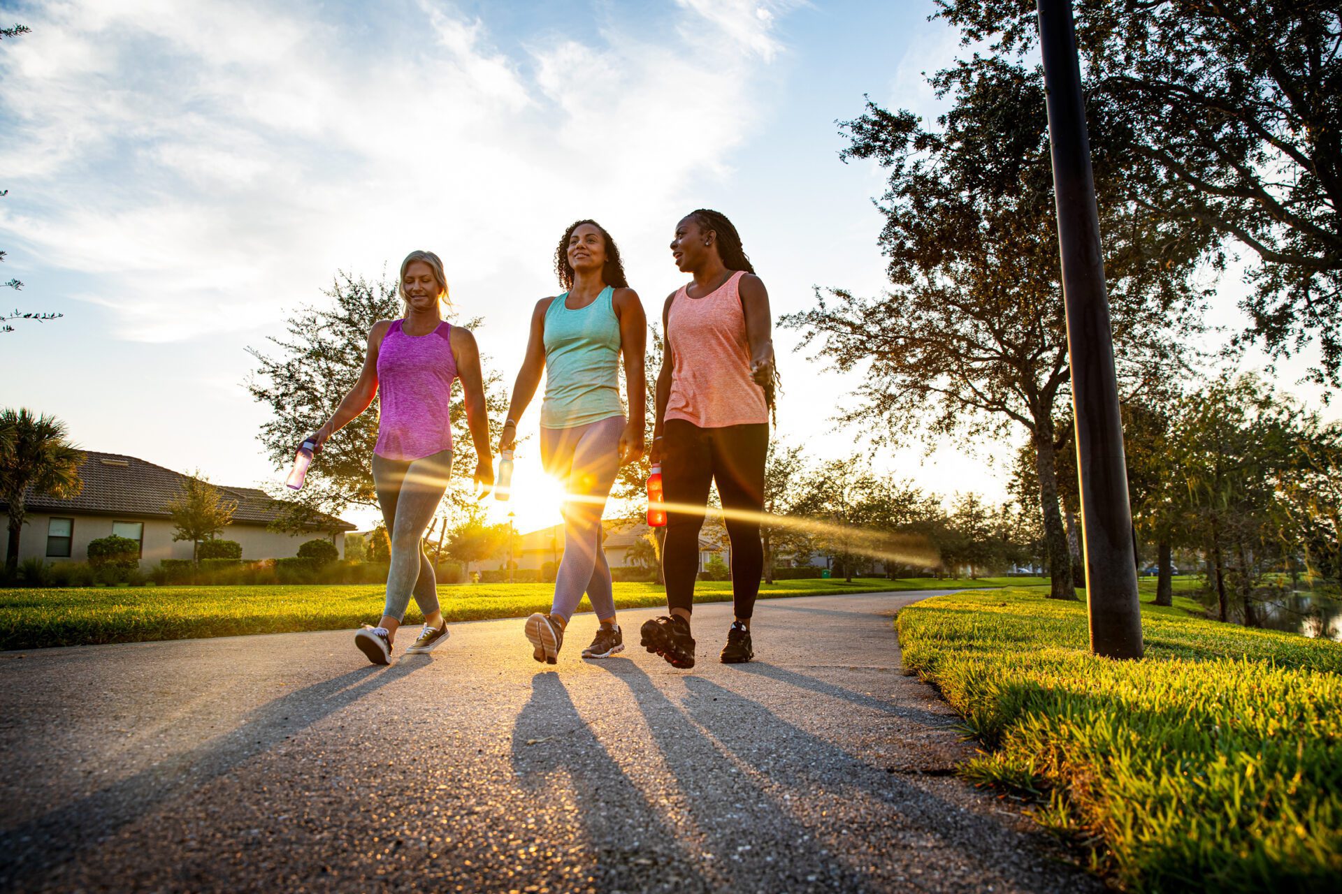 Group of three adult friends enjoy a morning walk around Ave Maria lakeWhen National Geographic Explorer Dan Buetter first coined the term “blue zone” he never imagined that nearly 100 communities across North America would adopt the wellness concepts his studies revealed. More than two decades ago, Buetter investigated places around the world where people regularly lived to 100 and beyond. He concluded that activity, plant-based diets and lasting social ties contributed to this longevity.