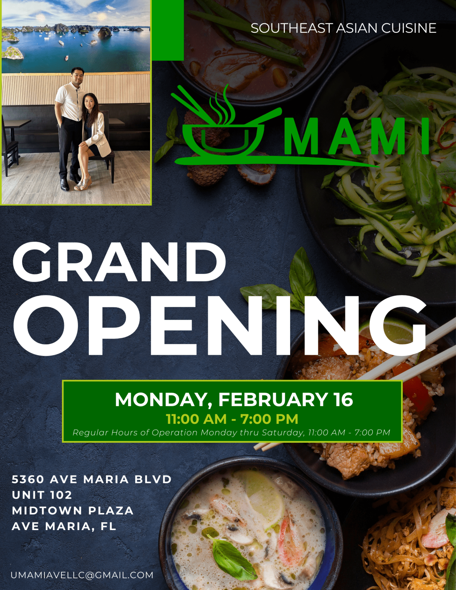 NAPLES, FL., – February 11, 2026 — Midtown Plaza tenant Umami Ave announces its grand opening for Monday, February 16. Owned and operated by chef Jason Cao, the Southeast Asian fusion restaurant melts Vietnamese, Thai, Cambodian and Japanese flavors. The menu celebrates dishes from different regions of Southeast Asia to bring unique and balanced flavors to traditional items. “The name Umami is what my cooking is all about,” said Cao. “Every culture has a different flavor profile and Asian cuisine is all about Umami – that extra-savory part of a dish that leaves you deeply satisfied.”